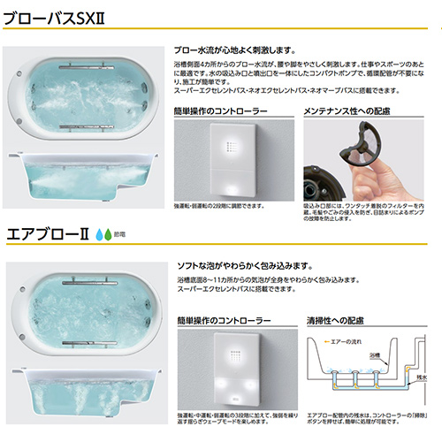 ・ブローバスSX2(浴槽側面4ヵ所からのブロー噴流が、腰や脚をやさしく刺激。仕事やスポーツのあとに最適です)