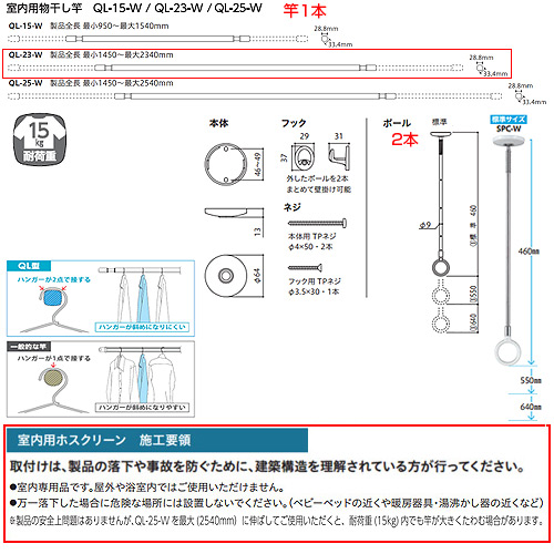 ■耐過重15kg以内 ※SPC型2本(目安重量16kg)-QL型本体重量=約15kg。 竿に均一に干した際の耐荷重です。