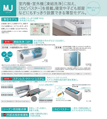 「凍結洗浄light」・「ステンレスクリーンシステム」・「3モード除湿」搭載薄型エアコン。