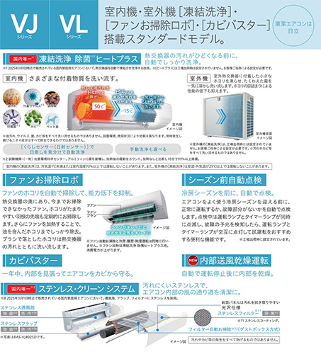 室内機、室外機「凍結洗浄」・「ファンお掃除ロボ」・「カビバスター」搭載スタンダードモデル。