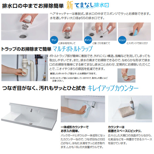 ・排水金具:ポップアップ排水栓(新てまなし排水口・ヘアキャッチャー付・フタ脱着式)