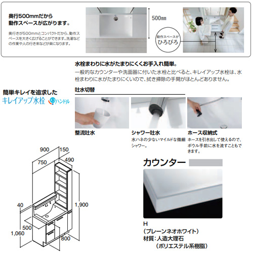 ●洗面化粧台セット クレヴィ[間口900mm][高さ1900mm][引出タイプ][シングルレバーシャワー水栓][ミラーキャビネットなし][一般地]