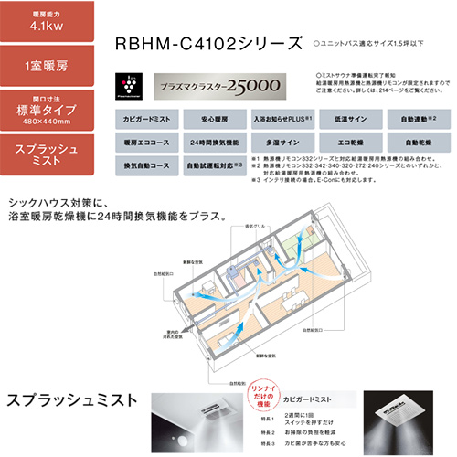 暖房、衣類乾燥、ミスト(カビガードスプラッシュ)、24時間換気の機能が付いた商品です。