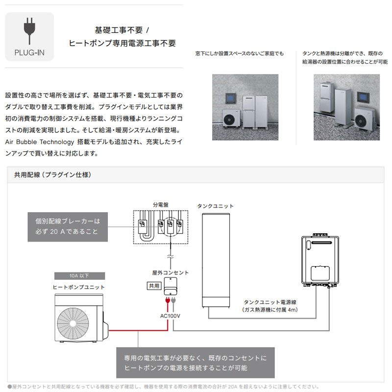 また、Plug-In Modelは、ヒートポンプ電源に屋外コンセントを利用する