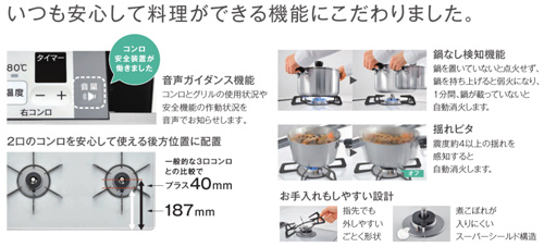 らくらく操作と音声ガイダンス機能で安心して使えるガスコンロ。