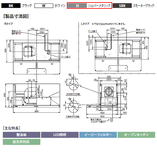 ●レンジフード プレミアムシリーズ[シロッコファン][幅90cm][スリム型][幕板付属][シルバーメタリック][左排気]