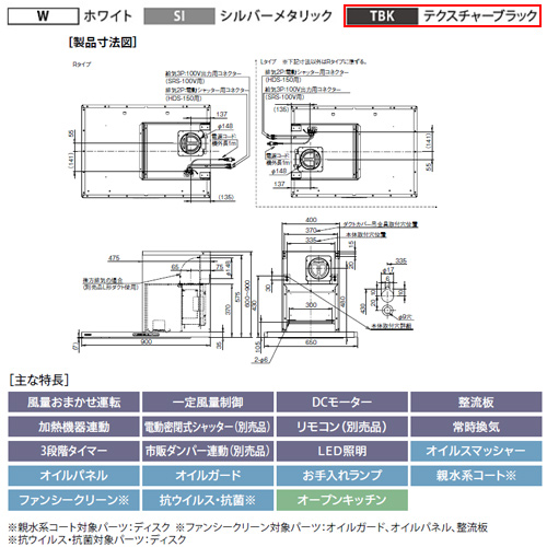 ●レンジフード プレミアムプラスシリーズ[シロッコファン][幅90cm][スリム型][常時換気][コンロ連動][オイルスマッシャー][ダクトカバー付属][テクスチャーブラック][左排気]