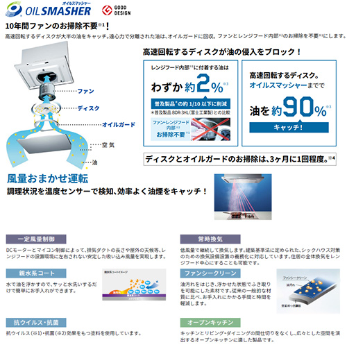 独自の「オイルスマッシャー」により、ファンとレンジフード内部への油の侵入をブロック。