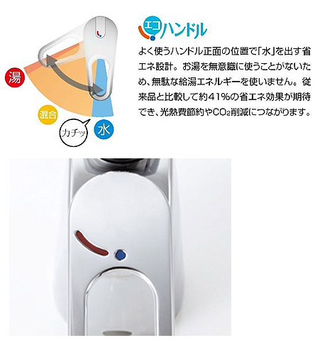 ハンドル正面の位置で「水」を出す省エネ設計。無意識に使っているお湯の無駄遣いを防ぎます。