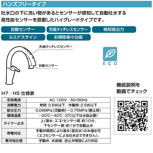 キッチン用蛇口 ナビッシュ[台][H7][タッチレス水栓][自動水栓][ハンズフリー][エコセンサー付][ホース引出式][AC100V][寒冷地]