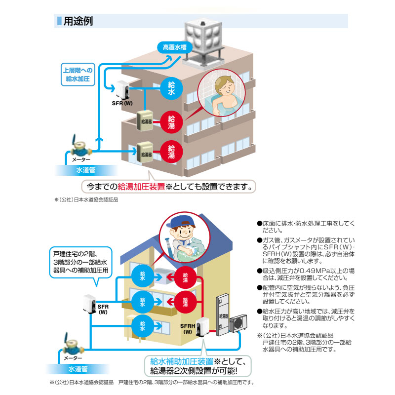 ・戸建住宅において直圧部分の圧力不足が懸念される2階、3階部分の一部給水器具(給湯器、トイレ・シャワー、手洗いなど)ヘ補助的に加圧することを目的に開発した水道直結タイプの『補給補助加圧装置』です。1戸住宅の全給水器具への加圧、集合住宅の1住戸への加圧目的には使用できず、別途受水槽方式などによる給水方法の検討が必要となりますので、ご注意お願いします。