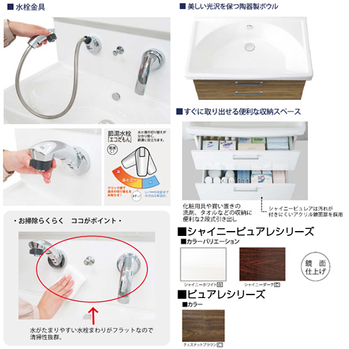 洗面化粧台セット シャイニーピュレア・ピュレア[間口750mm][高さ1910mm][2段引き出し][シャワー水栓(ホース引き出し)][3面鏡][LED][一般地]