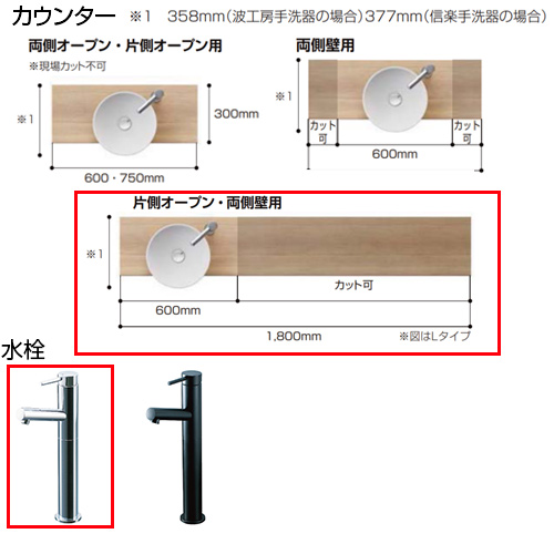 ※プランのカウンターは、ボウルから遠い側のみ現場カット可能です。カットする側の小口面は化粧されていませんので、必ず壁面に設置してください。