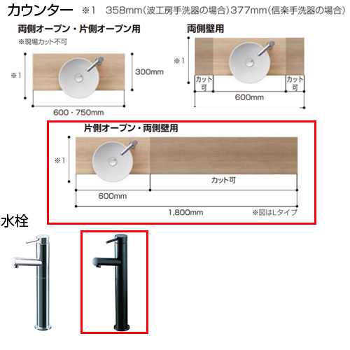 カウンター(ボウル位置:左片寄せ/間口有効寸法(壁間寸法)610〜1810mm)