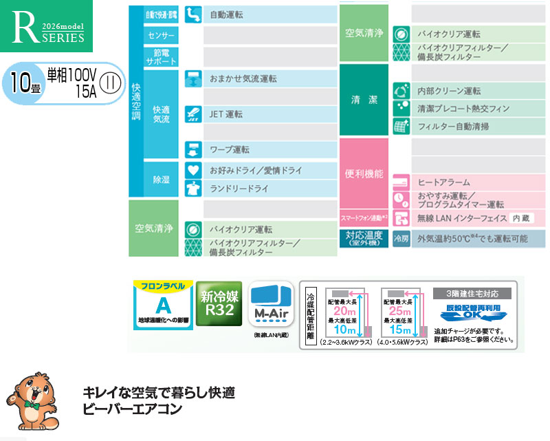 ルームエアコン[Rシリーズ][100V][10畳][2.8kW][ビーバーエアコン][ファインスノー][2026年モデル]