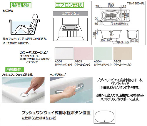 ●浴槽 グランザシリーズ[埋込浴槽][1500サイズ][和洋折衷タイプ][エプロンなし][プッシュワンウェイ][ハンドグリップ]