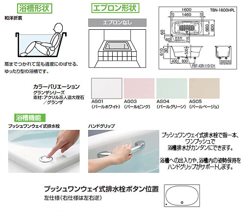 ●浴槽 グランザシリーズ[埋込浴槽][1600サイズ][和洋折衷タイプ][エプロンなし][プッシュワンウェイ][ハンドグリップ][アームレスト]