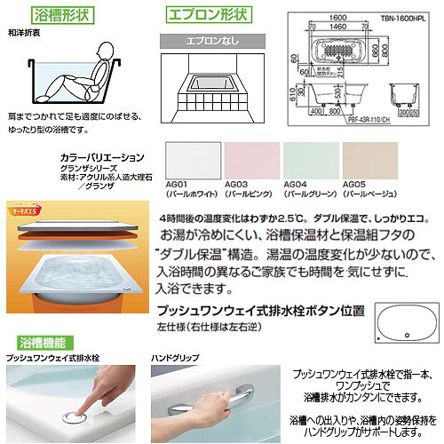 ●浴槽 グランザシリーズ[埋込浴槽][サーモバスS][1600サイズ][和洋折衷タイプ][エプロンなし][プッシュワンウェイ][ハンドグリップ][アームレスト]
