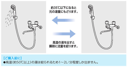 シャワー吐水時に高温の湯(50℃以上)を出そうとすると瞬時に流量を絞ります。