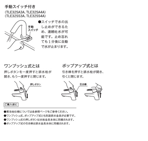 ※ワンプッシュ式は専用の排水金具が必要です。また、ワンプッシュ式排水金具だけでなく、ポップアップ式の排水金具も使用できます。