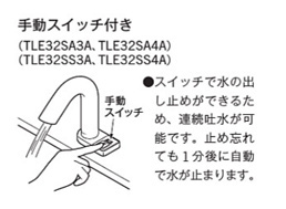 スイッチでの水の出し止めで連続吐水できます。止め忘れても約1分後に自動で水が止まります。