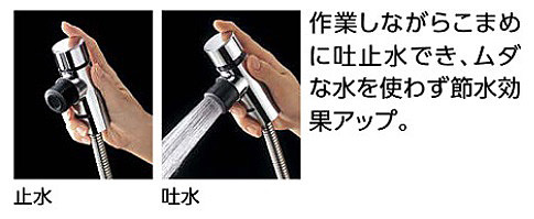 作業しながらこまめに吐止水でき、ムダな水を使わず節水効果アップ。