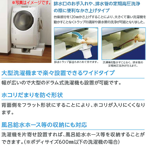 台座部分を115mmかさ上げすることにより、洗濯機を動かすことなくトラップの清掃や排水管の洗浄が可能となりました。