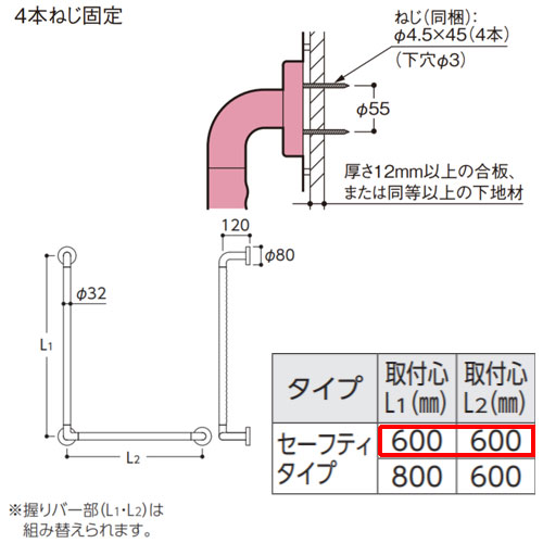 手すり インテリアバー[壁固定][L型][浴室用][長さ:600×600mm][φ32][前出:120mm][セーフティタイプ]