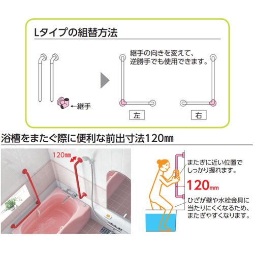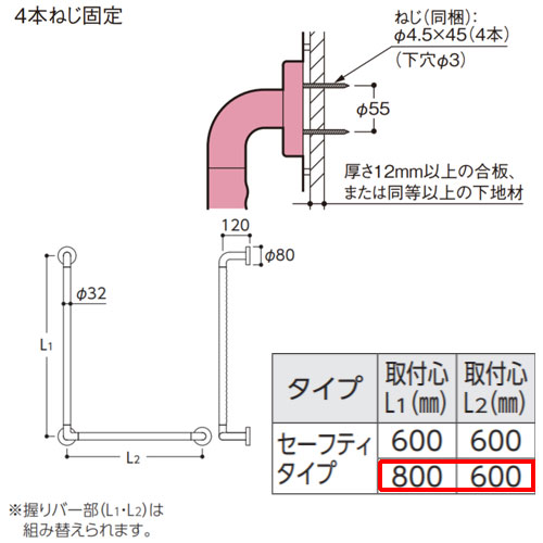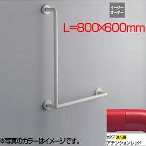 ●手すり インテリアバー[壁固定][L型][浴室用][長さ:800×600mm][φ32][前出:120mm][セーフティタイプ][アテンションレッド]