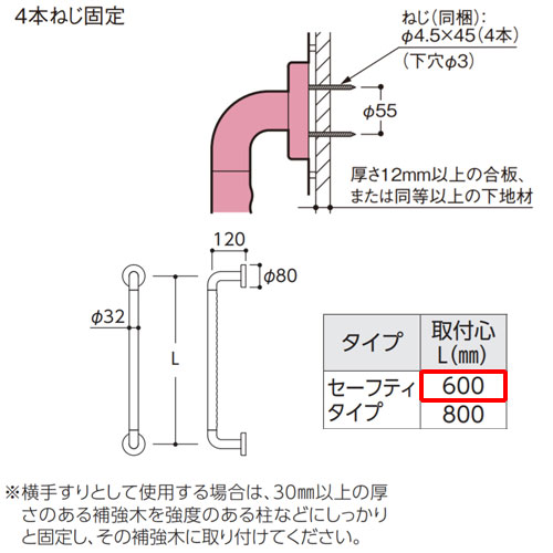 ※横手すりとして使用する場合は、30mm以上の厚さのある補強木を強度のある柱などにしっかりと固定し、その補強木に取付けて下さい。