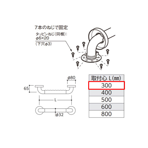 手すり インテリアバー[壁固定][I型][浴室用][長さ:300mm][φ32][前出:65mm][UB後付けタイプ][セーフティタイプ][ホワイト]