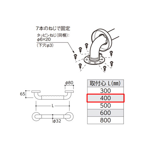 手すり インテリアバー[壁固定][I型][浴室用][長さ:400mm][φ32][前出:65mm][UB後付けタイプ][セーフティタイプ][ホワイト]