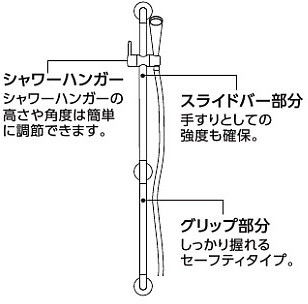 スライドするシャワーハンガーと手すりを1本にまとめた1台2役タイプです。