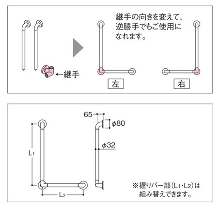 手すり インテリアバー[Fシリーズ][壁固定][L型][浴室用][長さ:600×600mm][φ32][前出:65mm][ソフトメッシュタイプ][R/L兼用][ホワイト]