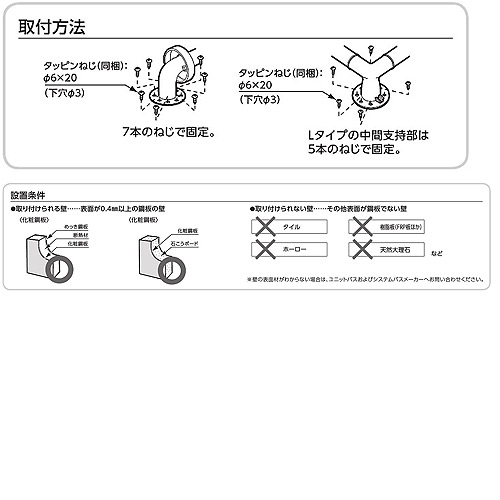 壁の表面材がわからない場合は、ユニットバスおよびシステムバスメーカーにお問合せ下さい。