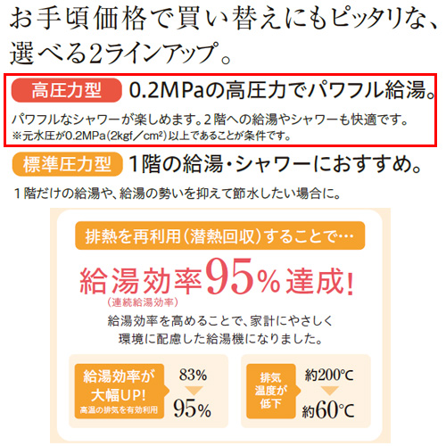 「高圧力型貯湯式」は、給湯圧力が貯湯式の2倍。※0.2MPa以上の給水元圧が必要です。
