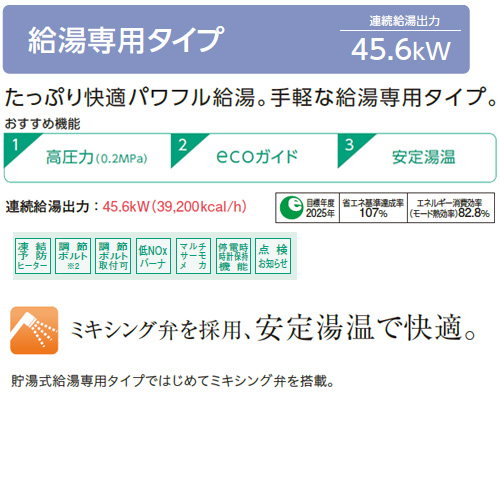 たっぷり快適パワフル給湯。手軽な給湯専用タイプ。