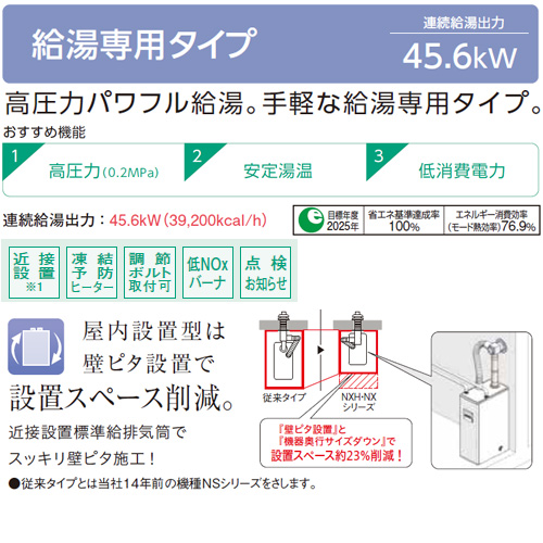 石油給湯器[台所リモコン付属(シンプル)][NXHシリーズ][給湯専用][手動][お知らせ][貯湯式][高圧力][屋内据置型][上方排気][強制給排気][4万キロ]