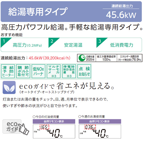 高圧力の快適給湯。スイッチポンでおまかせオートタイプ。