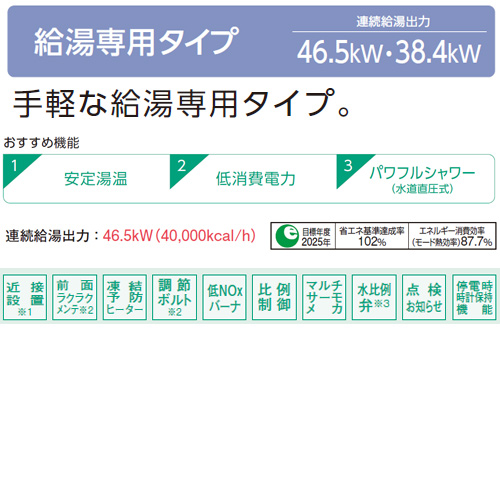 46.5kWの大出力。手軽な給湯専用タイプ。