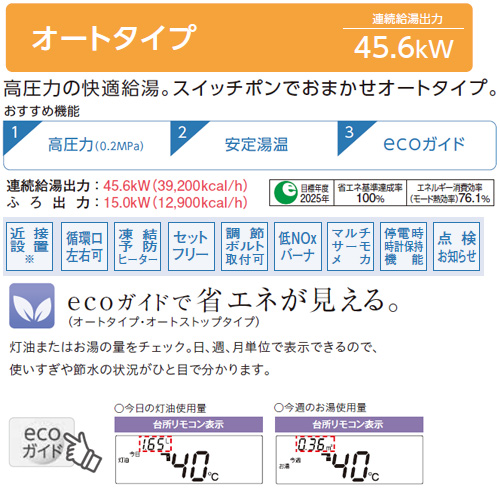 高圧力の快適給湯。スイッチポンでおまかせオートタイプ。