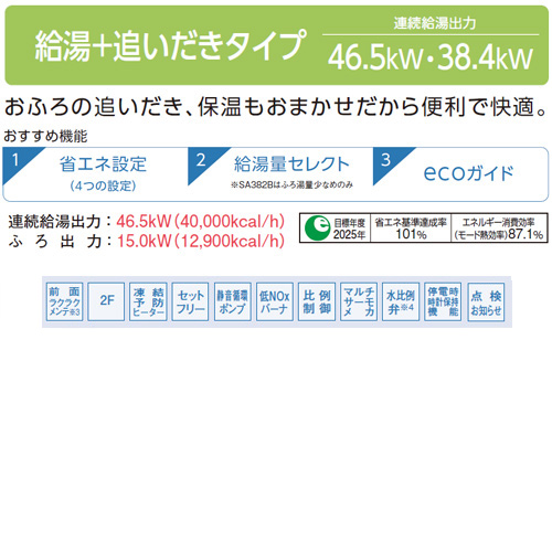 石油ふろ給湯器[浴室・台所リモコン付属(ボイス)][SAシリーズ][給湯+追いだき][手動][お知らせ][水道直圧式][屋内据置型][上方排気][強制排気][4万キロ]