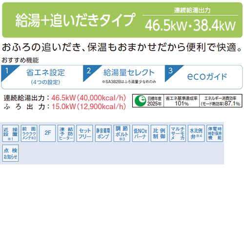 石油ふろ給湯器[浴室・台所リモコン付属(ボイス)][SAシリーズ][給湯+追いだき][手動][お知らせ][水道直圧式][屋外据置型][前面排気][4万キロ]