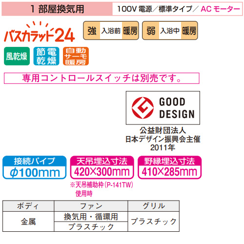 浴室換気暖房乾燥機 バスカラット24[電気式][天井埋込型][100V][24時間換気][1部屋用][ACモーター]