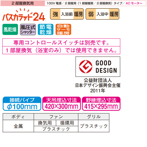 浴室換気暖房乾燥機 バスカラット24[電気式][天井埋込型][100V][24時間換気][2部屋用][ACモーター]