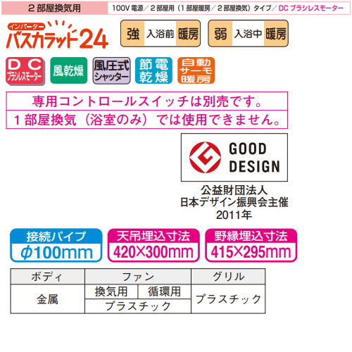 浴室換気暖房乾燥機 バスカラット24[電気式][天井埋込型][100V][24時間換気][2部屋用][DCブラシレスモーター]