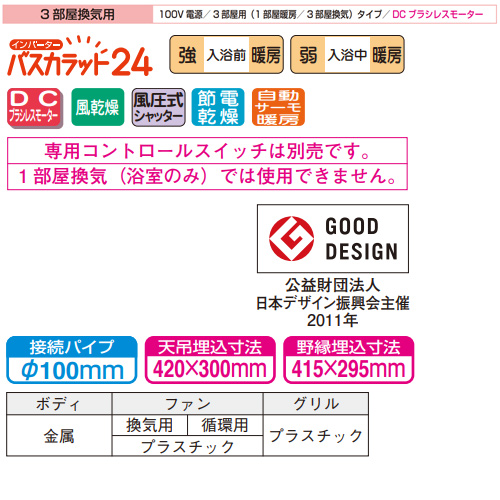 浴室換気暖房乾燥機 バスカラット24[電気式][天井埋込型][100V][24時間換気][3部屋用][DCブラシレスモーター]