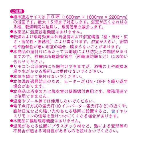 ・本商品は戸建住宅の浴室または脱衣室の壁面据付専用です。業務用途や集合住宅では使用できません。