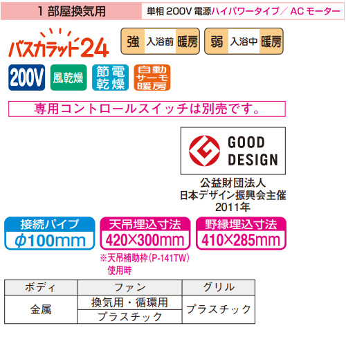 浴室換気暖房乾燥機 バスカラット24[電気式][天井埋込型][200V][24時間換気][1部屋用][ACモーター][ハイパワー]