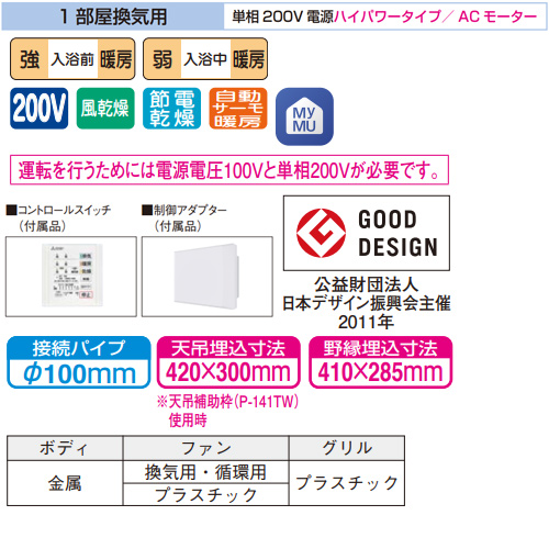 浴室換気暖房乾燥機 バスカラットリモート[電気式][天井埋込型][200V][1部屋用][ACモーター][ハイパワータイプ][エコキュート連携機能付]